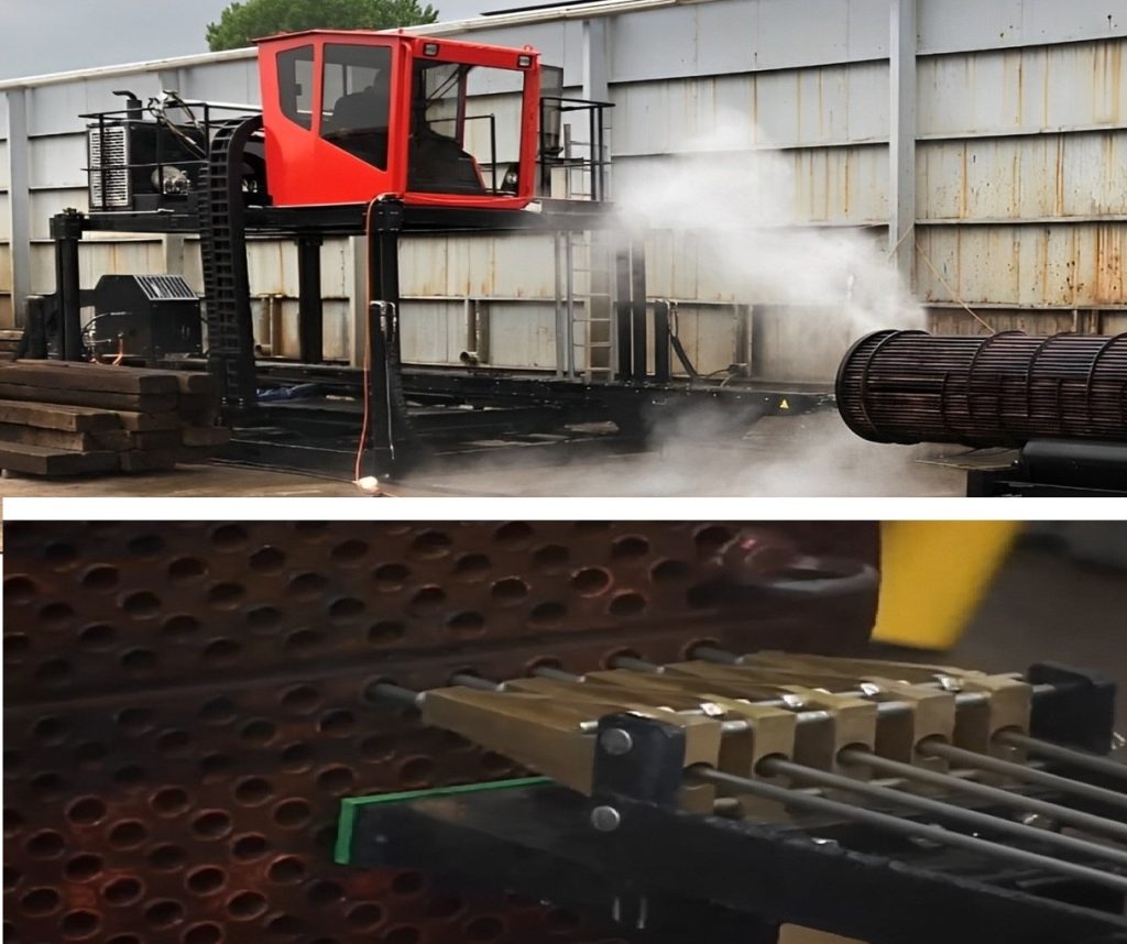 Efficient, reliable and safe system designed for fast cleaning of large numbers of heat-exchanger bundles during shutdowns. Five lances are operated safely from a protected cabin offering high visibility and comfort.